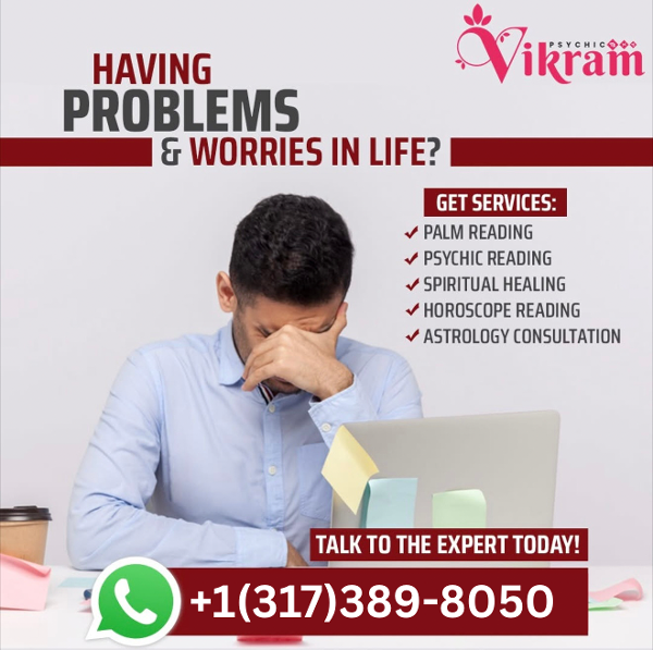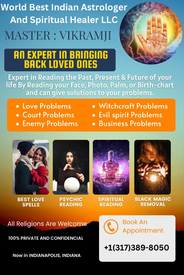 Master VIKRAM JI is a highly trusted astrologer and spiritual healer in Indianapolis, known for accurate psychic readings, Vedic astrology, and powerful spiritual solutions. With years of experience, he helps clients with love problems, marriage delays, relationship conflicts, career obstacles, business growth, negative energy removal, evil eye protection, and spiritual guidance.
