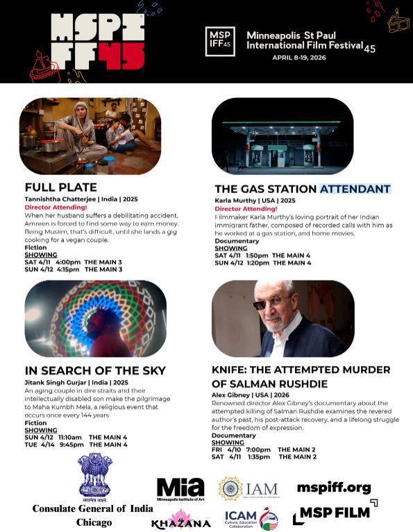 MSPIFF, aka the Minneapolis St. Paul International Film Festival, returns April 8-19, 2026 to celebrate its 45th anniversary with another awesome lineup of over 200 films from around the world, including Indian films (see below), plus parties, panels, visiting filmmakers, and special guests galore. Films will be shown at The Main, Minneapolis Institute of Art (Mia), Capri Theater in North Minneapolis, Landmark Center in St. Paul, Edina Mann Theatre, Rochester, MN.  As the largest annual celebration of international cinema in the region, MSPIFF45 promises to be its biggest festival yet!