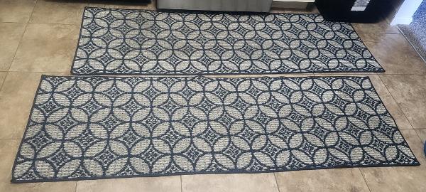 Set of two rugs with beautiful pattern, anti skit, in a good condition. Perfect for kitchen, hall area, dining area entry area of house. Immediate move out sale. Must go by Nov mid.